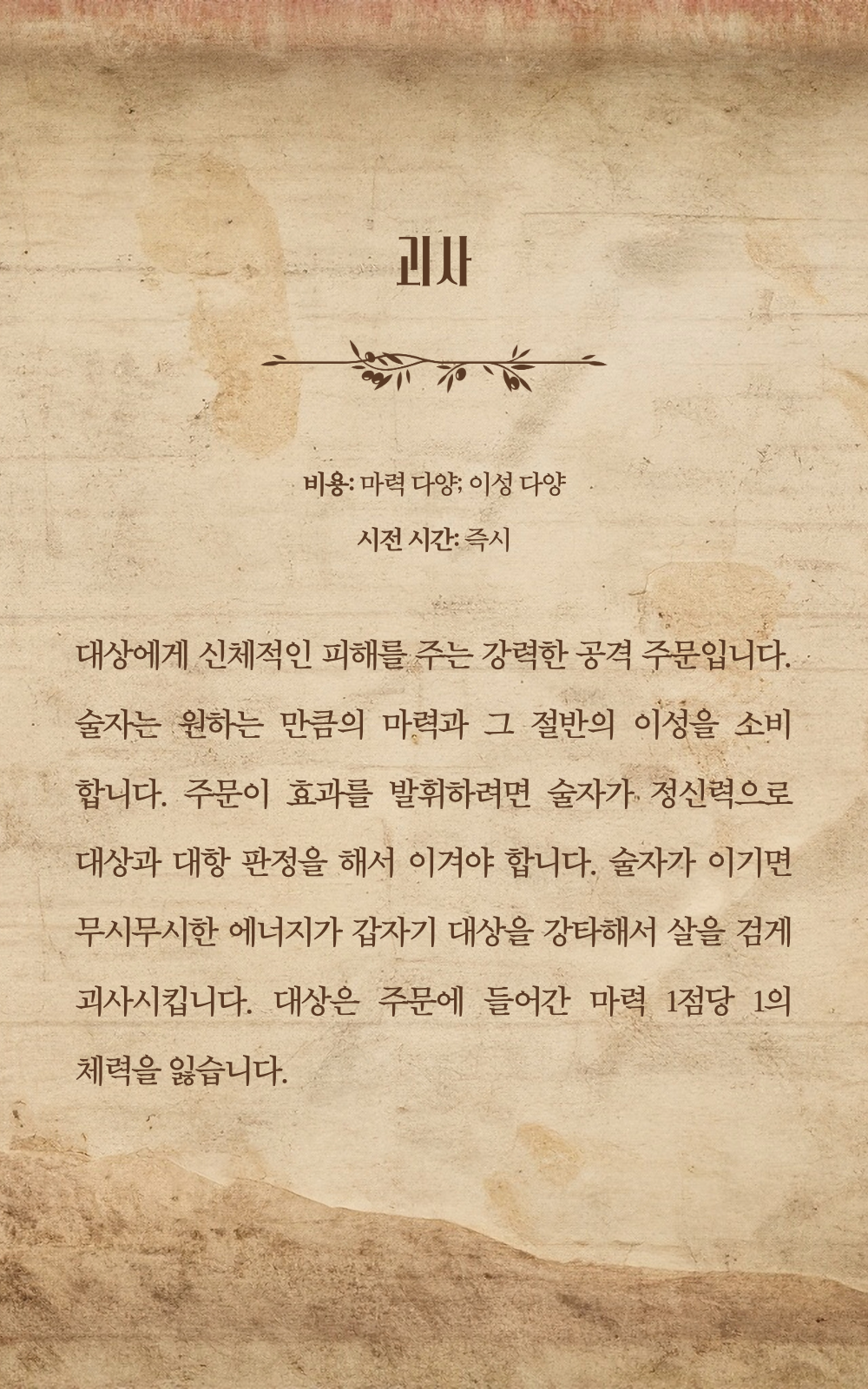 스크롤: 버려진 은신처에서 PC의 외모를 묘사한 스크롤입니다. (아래의 예시를 봐 주세요.)